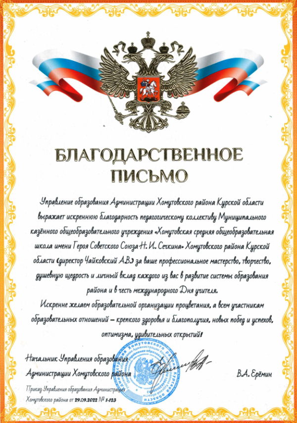 Благодарственное письмо Управления образования Администрации Хомутовского района Курской области.
